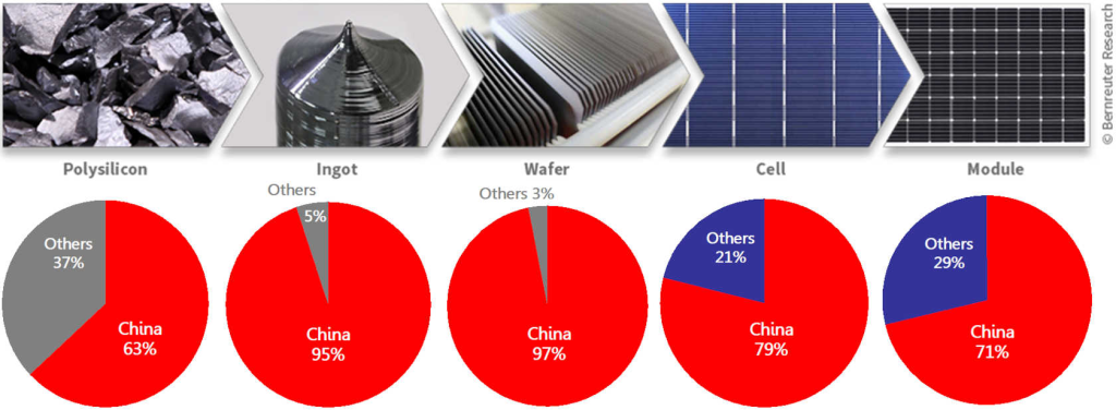 O processo de fabricação do painel fotovoltaico inclui ao menos 5 etapas de fabricação que podem ser listadas na seguinte ordem: produção do polisilício, lingote, wafer, células e módulo. Embora vários países do mundo tenham fábricas de painéis fotovoltaicos, a China concentra praticamente todas as etapas de fabricação. No caso dos wafers utilizados para fabricação das células fotovoltaicas, a China detem 97% da produção mundial desse insumo.